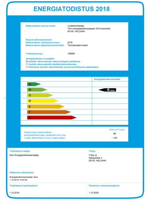 Energiatodistus on virallinen asiakirja, joka kuvaa rakennuksen energiatehokkuuden ja on pakollinen aina, kun olemassa oleva rakennus tai sen huoneisto myydään tai vuokrataan.